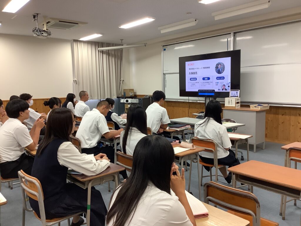 2024年9月29日、大分県立別府翔青高等学校にて、2年生53名を対象にオンライン授業「マーケティングアイデア【売れるしくみづくり】」を実施しました。授業では、株式会社メイカヒット代表の久保田が講師を務め、消費者行動の理解とナッジ理論をテーマに、「人が思わず選んでしまう仕組み」について実例を交えながら解説しました。